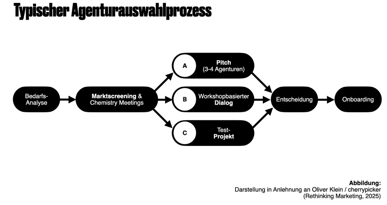 Der gesamte Auswahlprozess – von der Bedarfsanalyse des Kunden bis zum Onboarding der Agentur – verläuft dabei in der Regel entlang marktüblicher Schritte. Unterschiede ergeben sich vor allem in den einzelnen Wettbewerbsstufen: Manche bevorzugen ein klassisches Pitch-Szenario, andere einen workshopbasierten Dialog, wieder andere eine Art bezahltes Testprojekt.